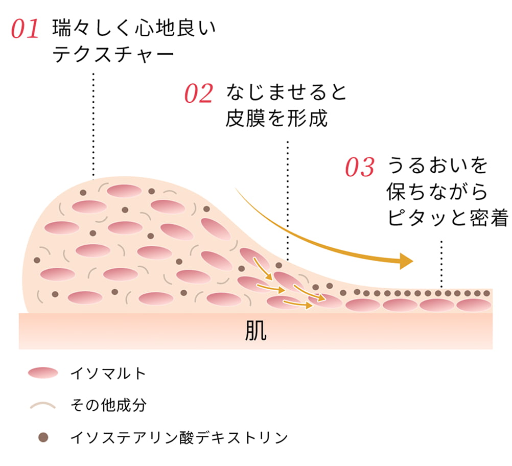 ※4 肌に密着し化粧持ちとうるおいが持続するイソステアリン酸デキストリンとイソマルトの選択が世界初である(先行技術調査およびMintel社データベースを用いた伊勢半調べ 2025年10月)