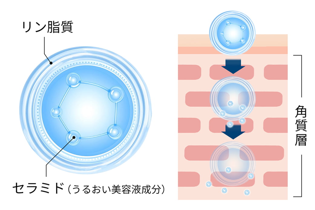 肌との親和性が高いセラミド(うるおい美容液成分)を閉じ込めた多重構造のモイストカプセルが、角質層までうるおいを届けます。外側からゆっくりほどけながら肌に浸透することで、しっとりとした仕上がりを長時間サポートします。