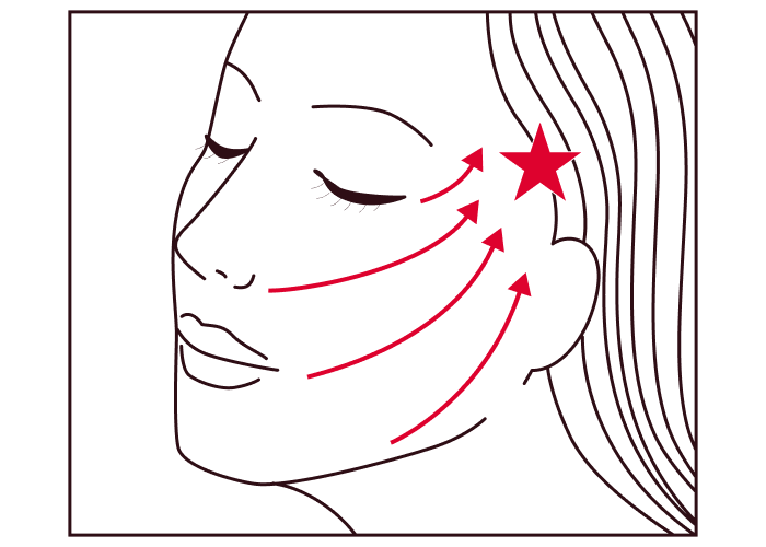 化粧水等でお肌を整えた後、気になるフェイスライン・ほうれい線・小鼻の横・目尻から、こめかみ(★部分)に向かって、ほおを引き上げるように、マッサージしながら塗ります。