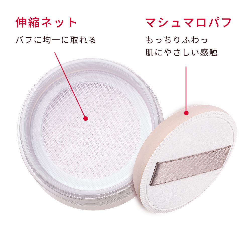 パフに均一にパウダーがとれる伸縮ネットと、もっちりふわっと肌にやさしい感触のマシュマロパフで、粉浮きを防いでムラなく肌に密着します。